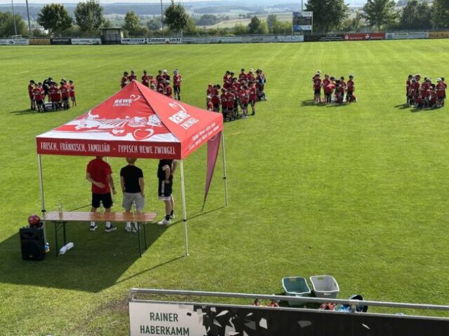 Für das leibliche Wohl der Nachwuchskicker sorgte der TSV Lonnerstadt mit einer hervorragenden Verpflegung. Besonders beliebt waren die täglichen Obstpausen, die nicht nur für eine gesunde Erfrischung sorgten, sondern auch dankbar angenommen wurden. Das frische Obst wurde freundlicherweise vom ortsansässigen REWE-Markt Zwingel gespendet, der zusätzlich mit einem aufgestellten Pavillon für ein schattiges Plätzchen und etwas Abkühlung sorgte.