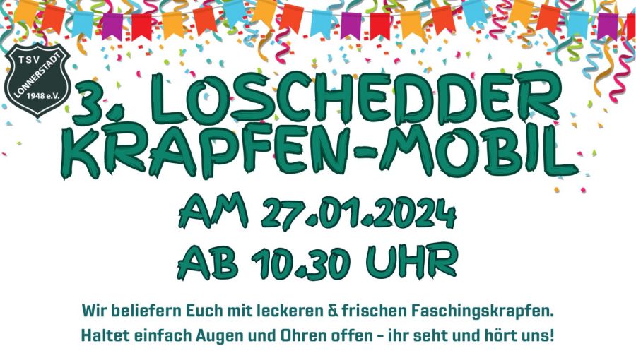 Das 3. Loschedder Krapfen-Mobil ist am 27.01.2024 wieder unterwegs. Wir beliefern Euch mit leckeren & frischen Faschingskrapfen. Haltet einfach A…